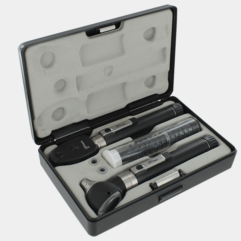 „Optima“ diagnostikos rinkinys, kurį sudaro kišeninis oftalmoskopas su rankena, kišeninis otoskopas su rankena, atsarginė otoskopo lemputė, atsarginė oftalmoskopo lemputė – visa tai įdėta į kietą plastikinį dėklą.