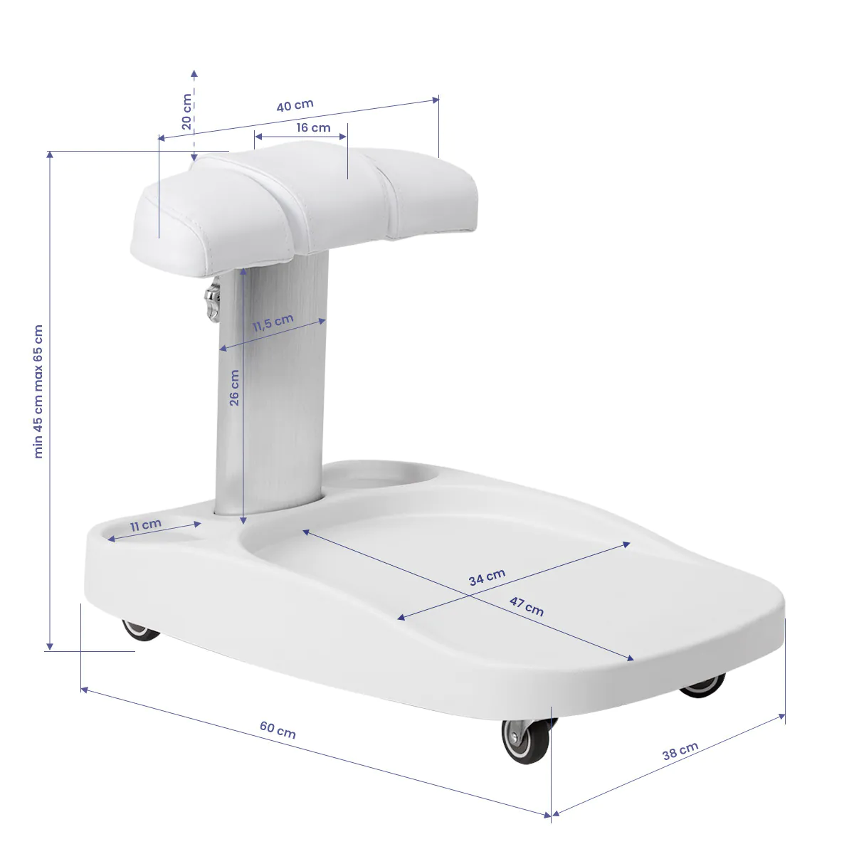 Dėl to vežimėlį galima pritaikyti prie individualių naudotojo poreikių, todėl jis yra puikus sprendimas tiek kosmetinėms, tiek podiatrinėms procedūroms, užtikrinantis komfortą ir darbo tikslumą įvairiose padėtyse.