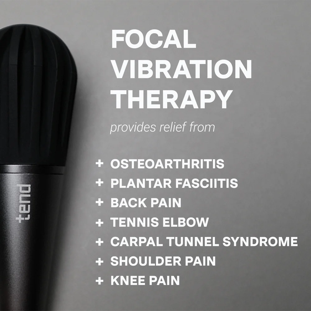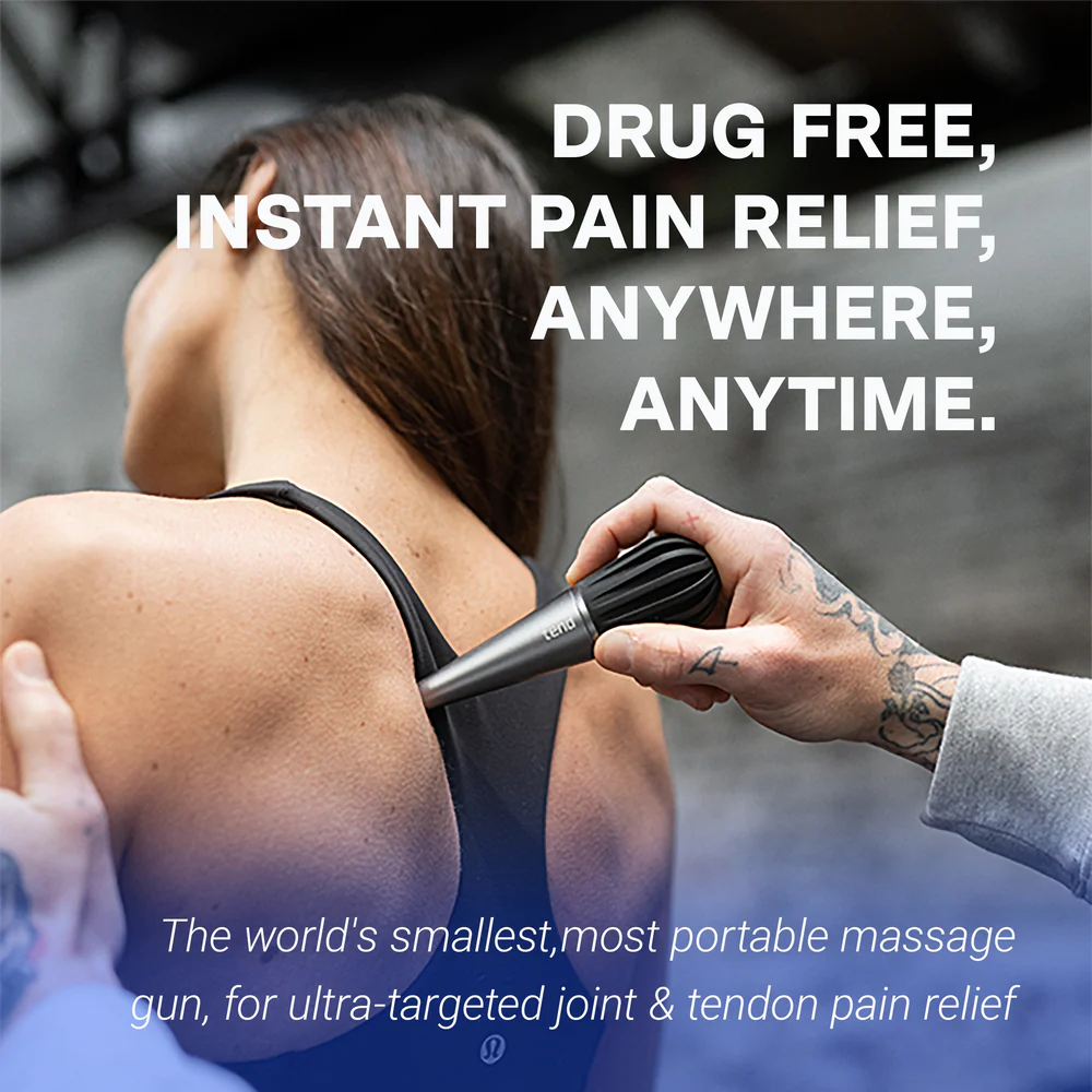 „Tend Deep” – nešiojamasis masažuoklis greitam tikslingam sąnarių ir sausgyslių skausmo malšinimui naudojant židininę vibracijos terapiją, ergonomiškai suprojektuotas taip, kad būtų galima tvirtai suimti ir taikyti gilią terapiją